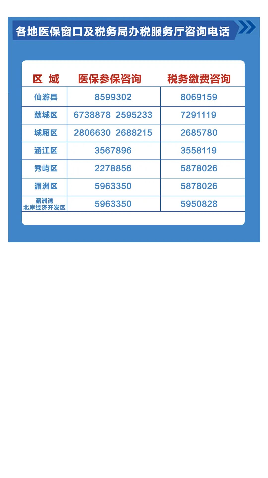 咨询途径 1 医保参保咨询:关注微信公众号“莆田医疗保障”或拨打医保窗口咨询电话,或咨询当地医保经办服务窗口。 2 税务缴费咨询:关注微信公众号“福建税务”“莆田税务”,或拨打咨询电话12366,或咨询当地税务机关办税服务厅。 ![]() |
