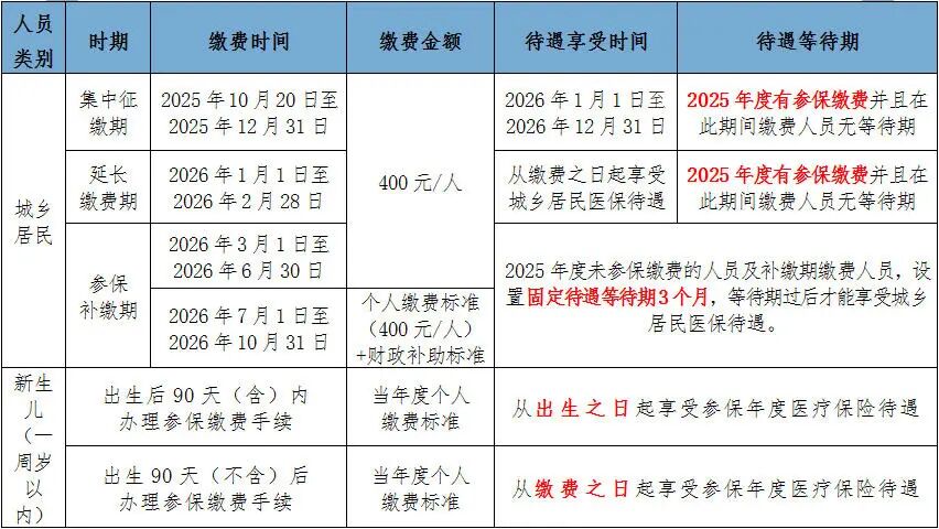 缴费期限 城乡居民医保实行按年度参保缴费。2026年度我市城乡居民医保缴费时间、缴费金额及待遇享受时间具体规定如下: ![]()
